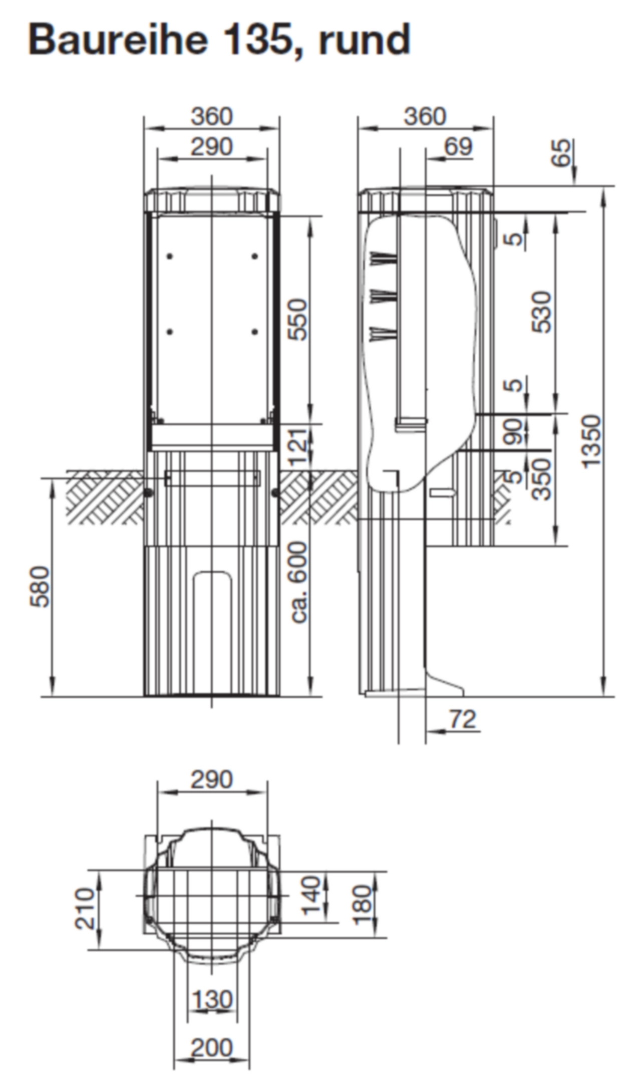 Verteilersäule Baureihe 135 rund, mit MP 550x290mm, Stecktür, 1350x360mm